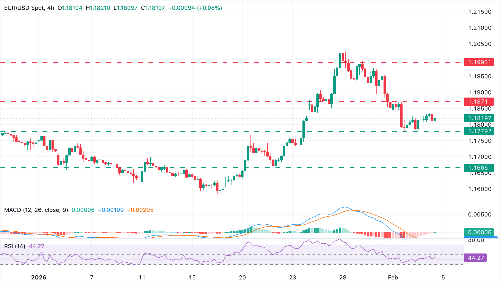 欧元从时段高点回落,但仍高于1.1800,当前兑美元(USD)交易于1.1820,日内几乎持平。欧元区的通胀和服务业活动数据未能为欧元提供任何显著支持,投资者现在将注意力转向美国ADP就业变动。
