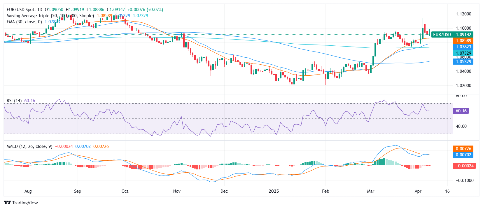 欧元/美元周二出现温和看涨,结束了连续两天的下跌,并在特朗普政府广泛的“对等”关税于4月9日生效前录得一些最后时刻的涨幅