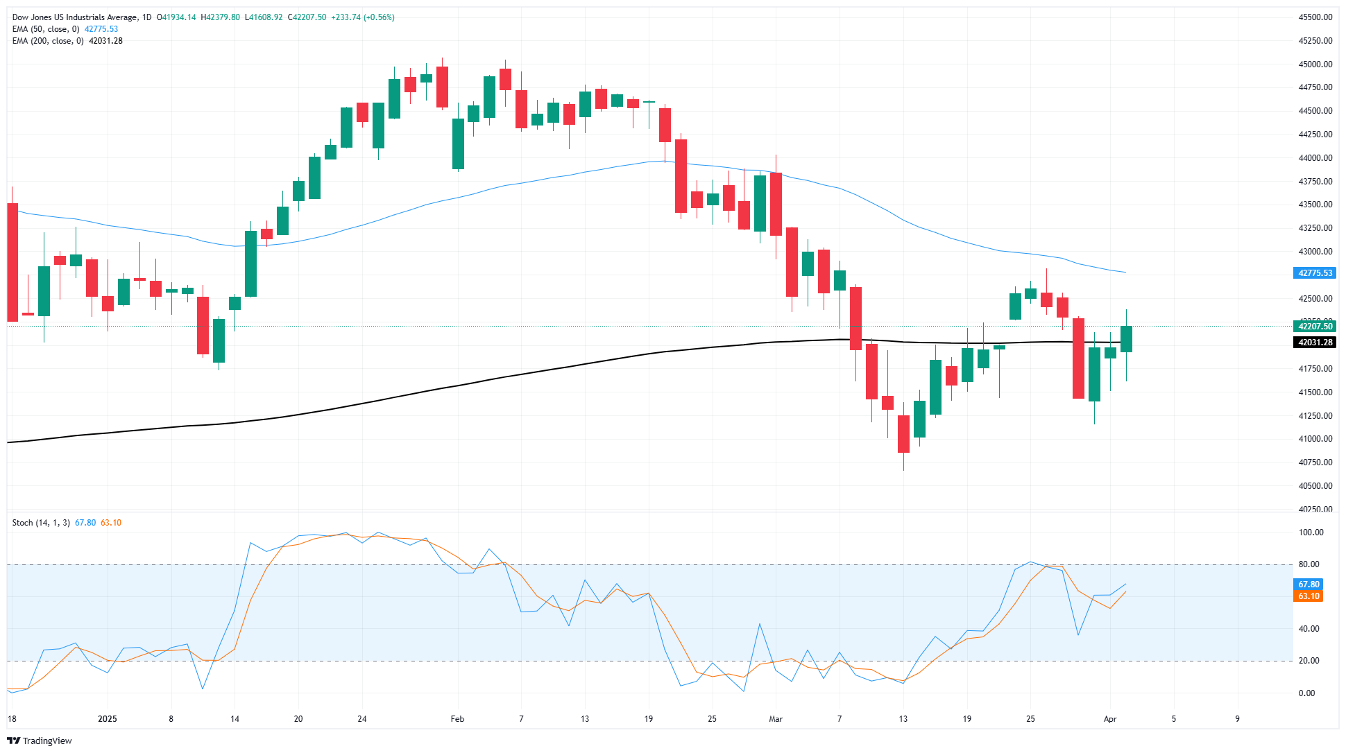 道琼斯工业平均指数(DJIA)在周二早盘交易中上涨,攀升350点,较当天开盘报价上涨0.85%,投资者押注特朗普政府期待已久的“对等”关税方案不会像美国总统唐纳德·特朗普所威胁的那样具有毁灭性。