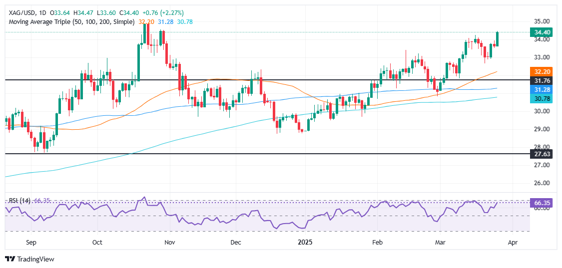 周四,白银价格大幅上涨,突破 34.00 美元关口,因美国贸易政策的不确定性,特别是对所有汽车征收 25% 关税,增加了对贵金属的需求。