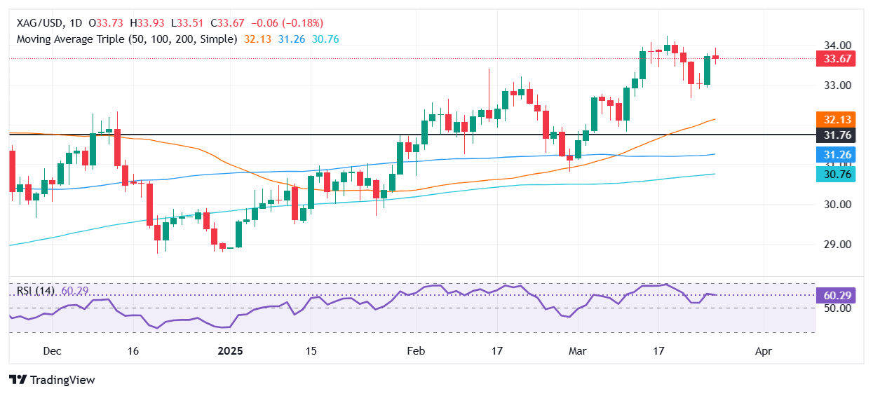 白银价格在达到四天高点 33.92 美元后回落 0.32%