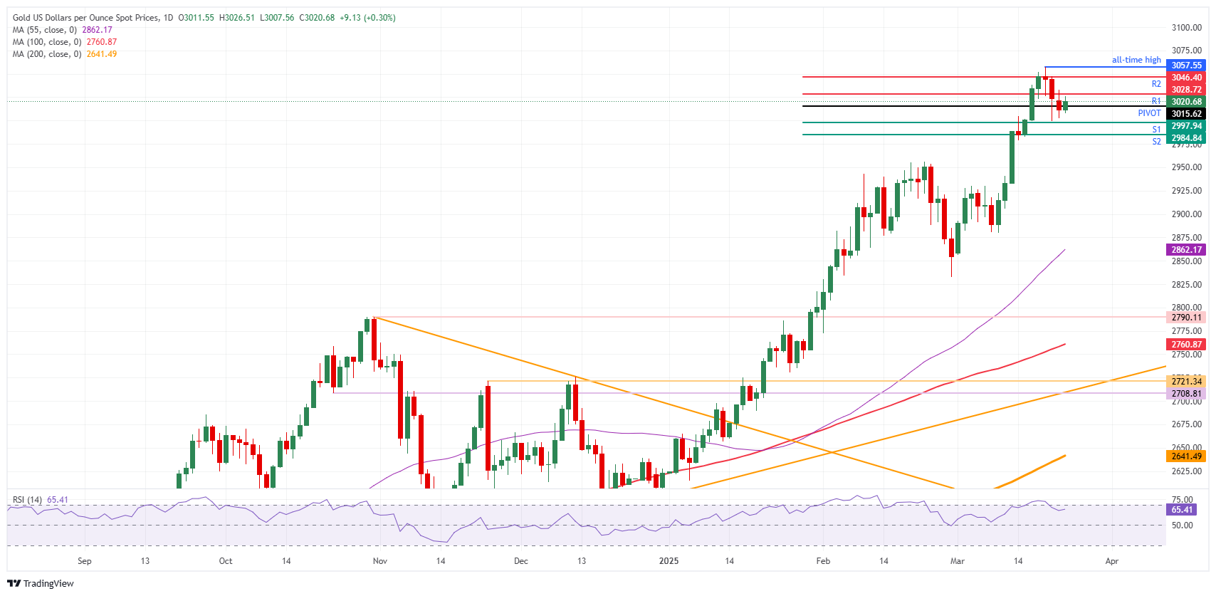 黄金价格(黄金/美元)在周二撰写时徘徊在3020美元上方,市场正在分析美国总统唐纳德·特朗普最新的关税承诺。总统在周一发布了一项行政命令以