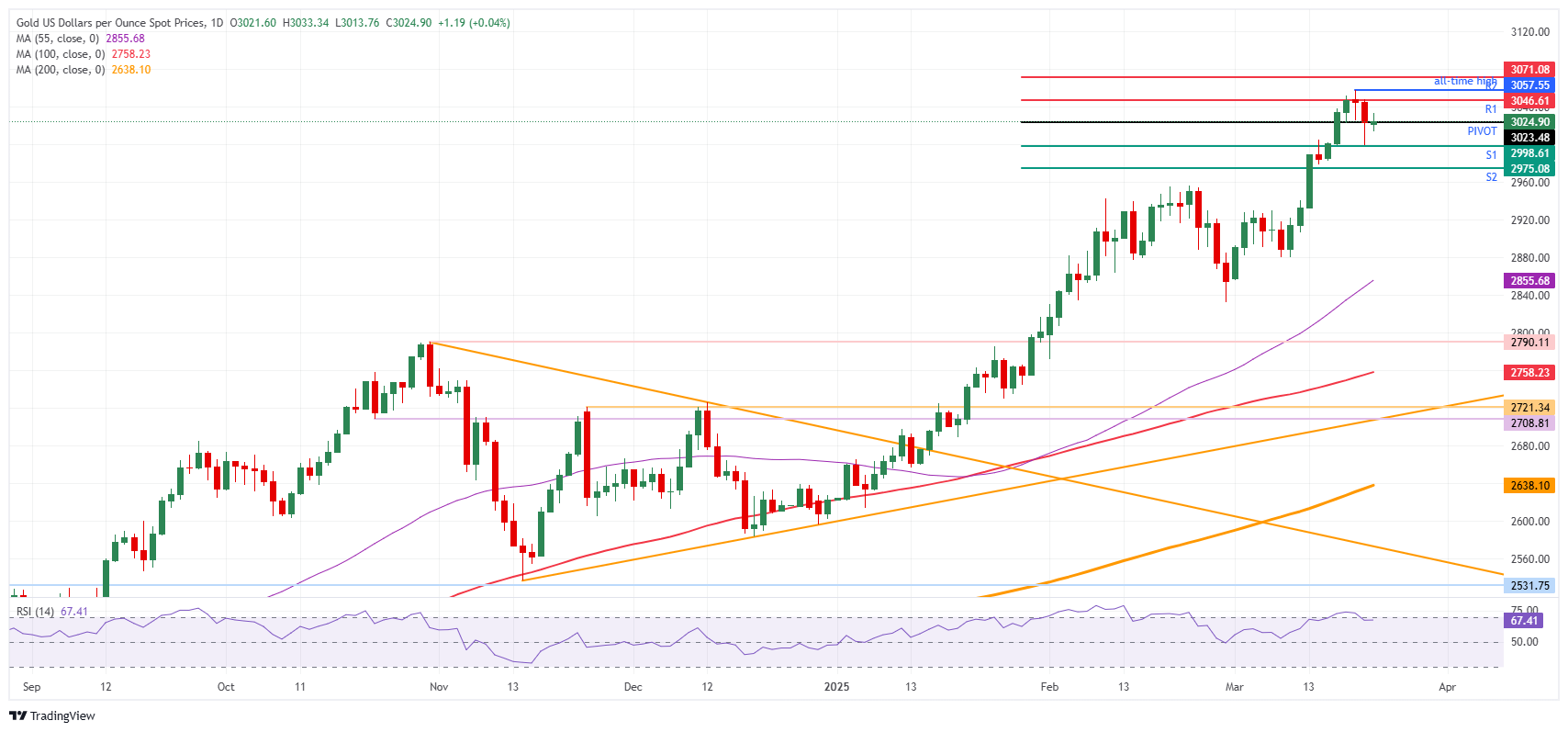 黄金价格(黄金/美元)在撰写时徘徊在3020美元附近,寻求方向,受到周末新关税消息的影响。消息称特朗普政府将放宽广泛的关税范围