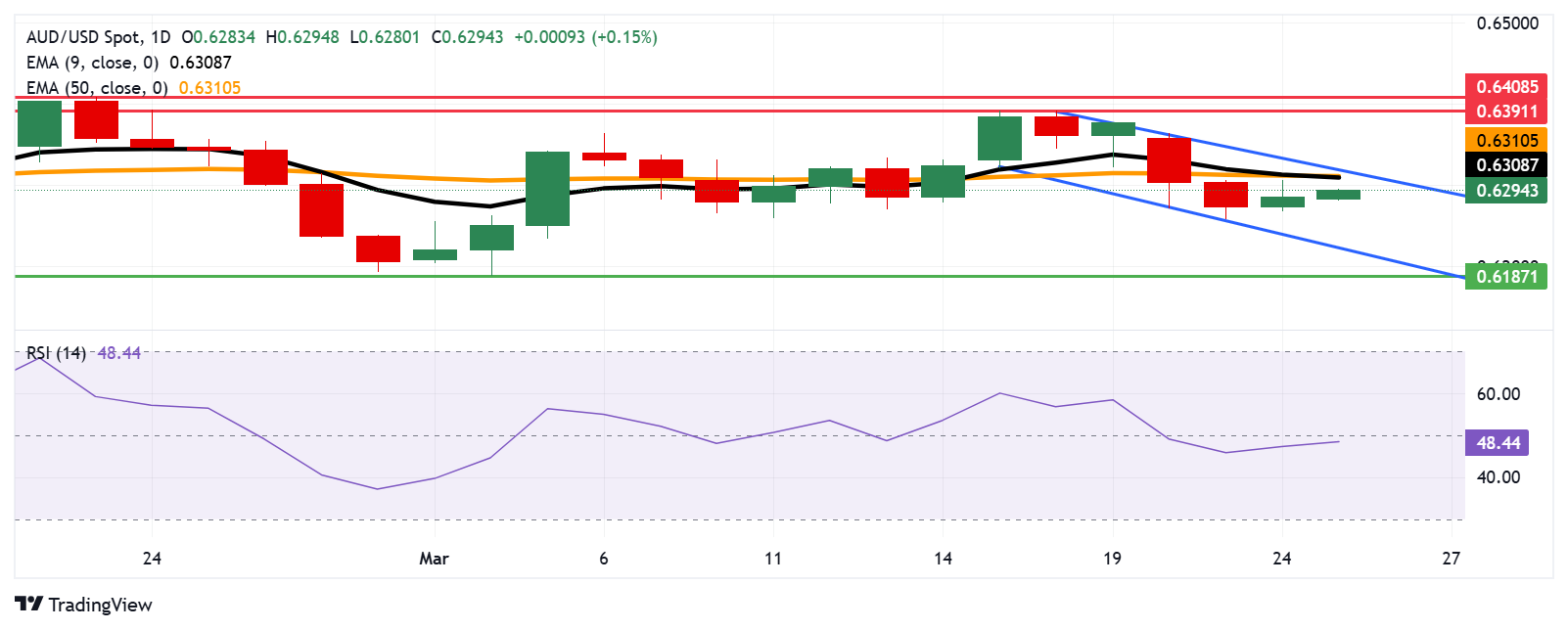 周一,澳元/美元小幅走高,汇率接近 0.6300 水平,此前从上周触及的 0.6260 附近低点反弹。