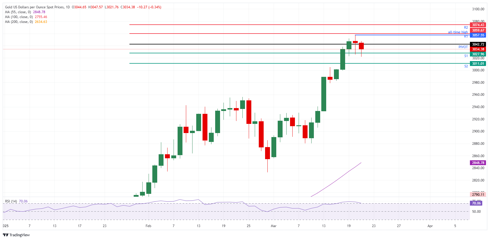 黄金价格(黄金/美元)面临第二天的下跌,但周度表现仍然积极。该贵金属在周五撰写时交投于 3,030 美元附近,此前一天曾达到 3,057 美元的历史新高。这一下行