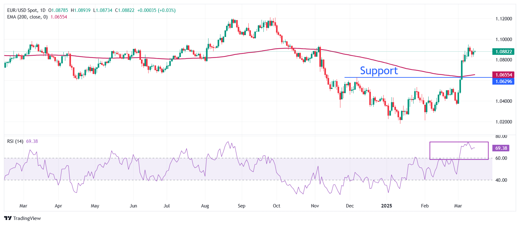 欧元/美元在周一北美交易时段上涨至接近 1.0900。