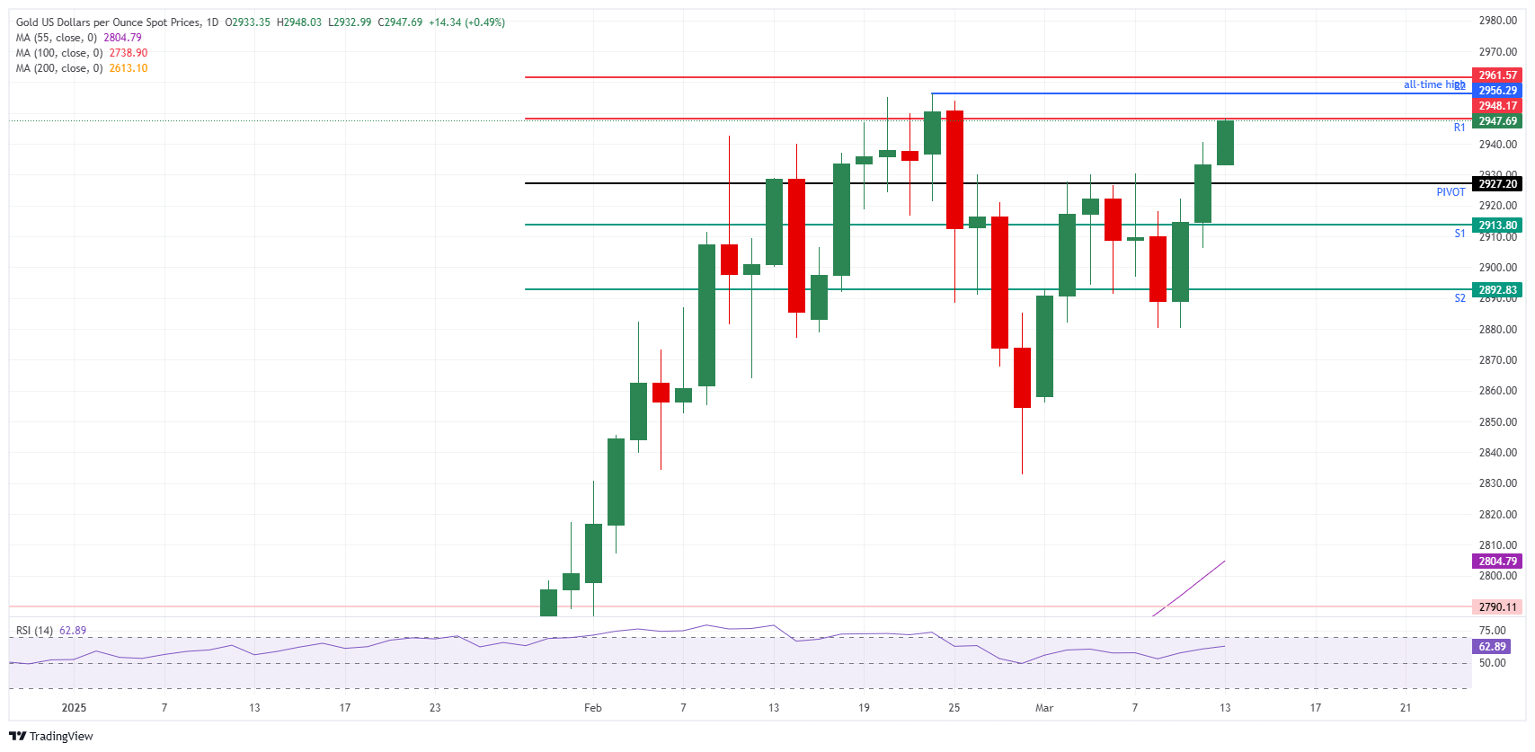 黄金价格(黄金/美元)接近2,950美元的关口,并在美国(US)消费者物价指数(CPI)数据周三低于预期后,对创下新历史高点充满良好希望,这在美国市场引发了一阵松口气的反应