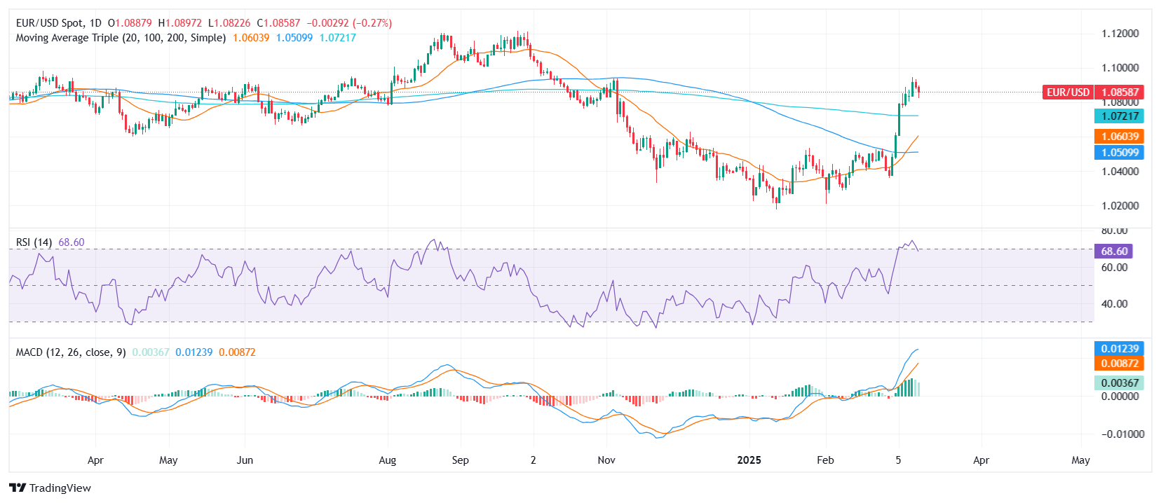 欧元/美元在创下新高后回落,周四欧洲时段后交易接近 1.0850 区域。