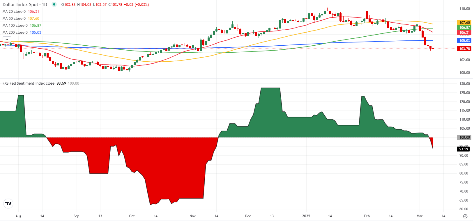 美元指数(DXY)跟踪美元(USD)对六种主要货币的表现,目前维持在约103.75的水平,未受当前市场动荡的影响。交易者正在推动美国股市下跌,同时考虑美国总统唐纳德·特朗普最近的评论
