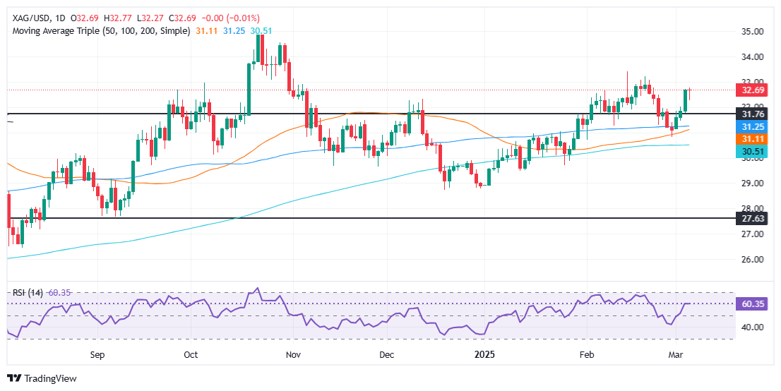 白银价格预测:白银/美元在32.50美元附近盘整,出现十字星形态