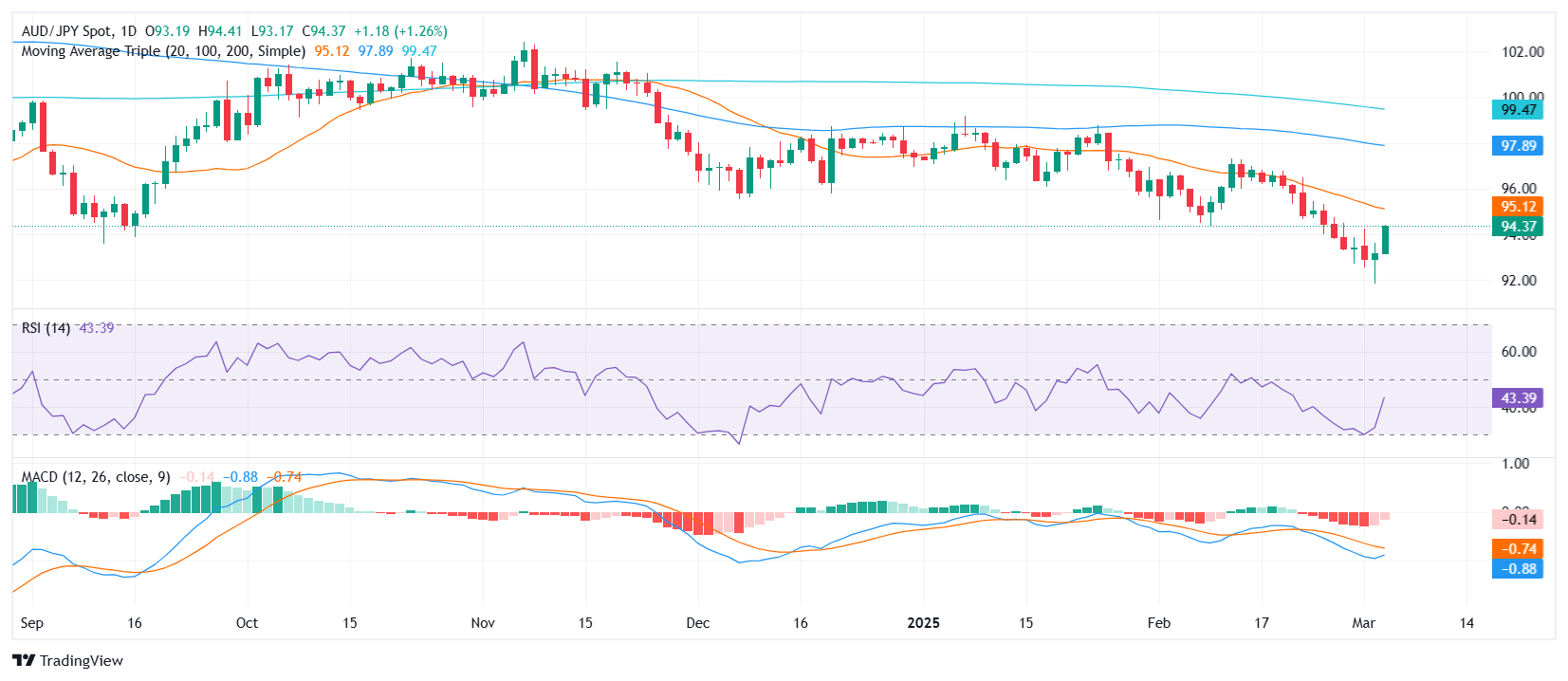 周三,澳元/日元出现复苏迹象,在经历了长时间的看跌走势后小幅上涨。