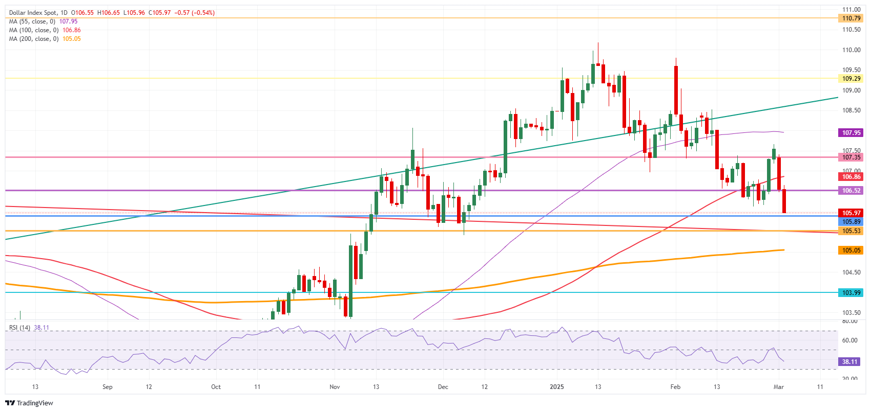 美元指数(DXY)跟踪美元(USD)对六种主要货币的表现,在美国总统唐纳德·特朗普确认对加拿大和墨西哥征收关税后,周二出现波动,短暂跌破106.00