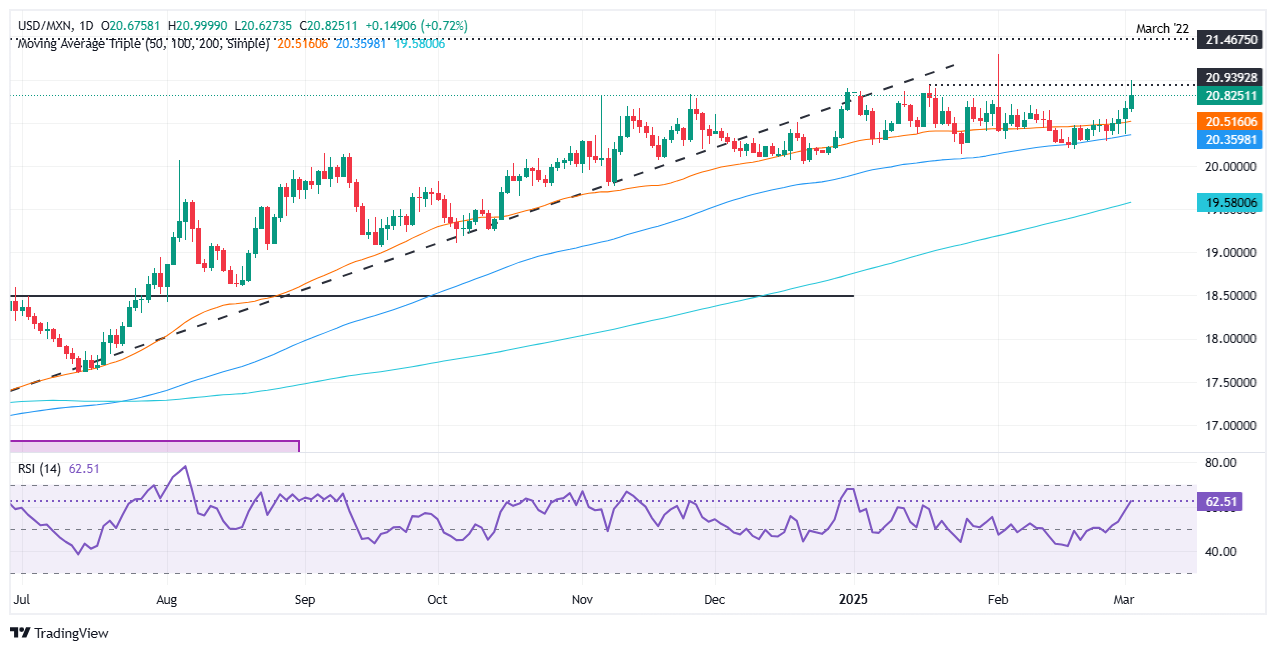 由于美国总统唐纳德·特朗普对墨西哥实施的25%关税开始生效,墨西哥比索(MXN)周二兑美元(USD)大幅下跌。