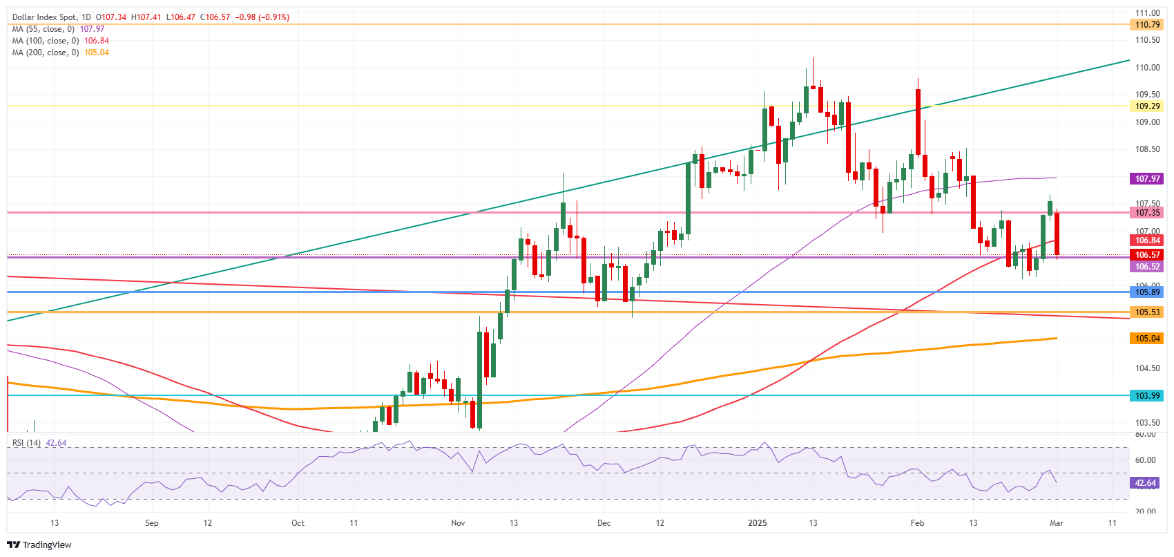 美国美元指数(DXY)追踪美元(USD)对六种主要货币的表现,目前正下滑至106.50,抹去周四和周五的低点,截至周一撰写时市场情绪有所改善,欧洲