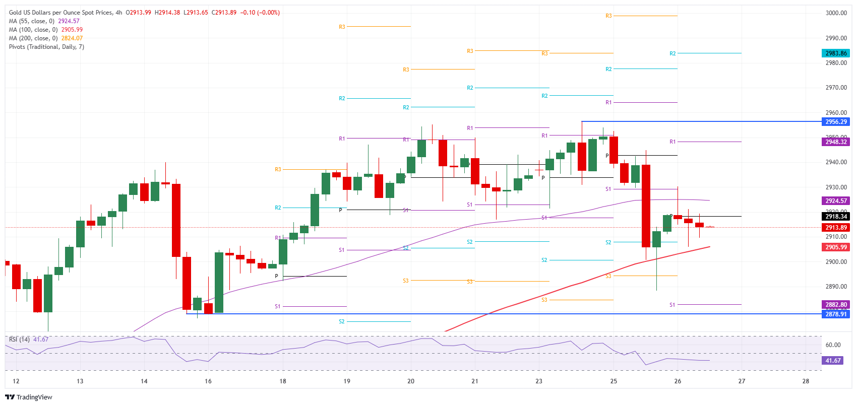 黄金/美元价格在周三撰写时接近2,910美元,经过前一天1.3%的下跌后,因交易者对美国消费者信心数据和总统的更多关税威胁感到担忧而巩固了其地位