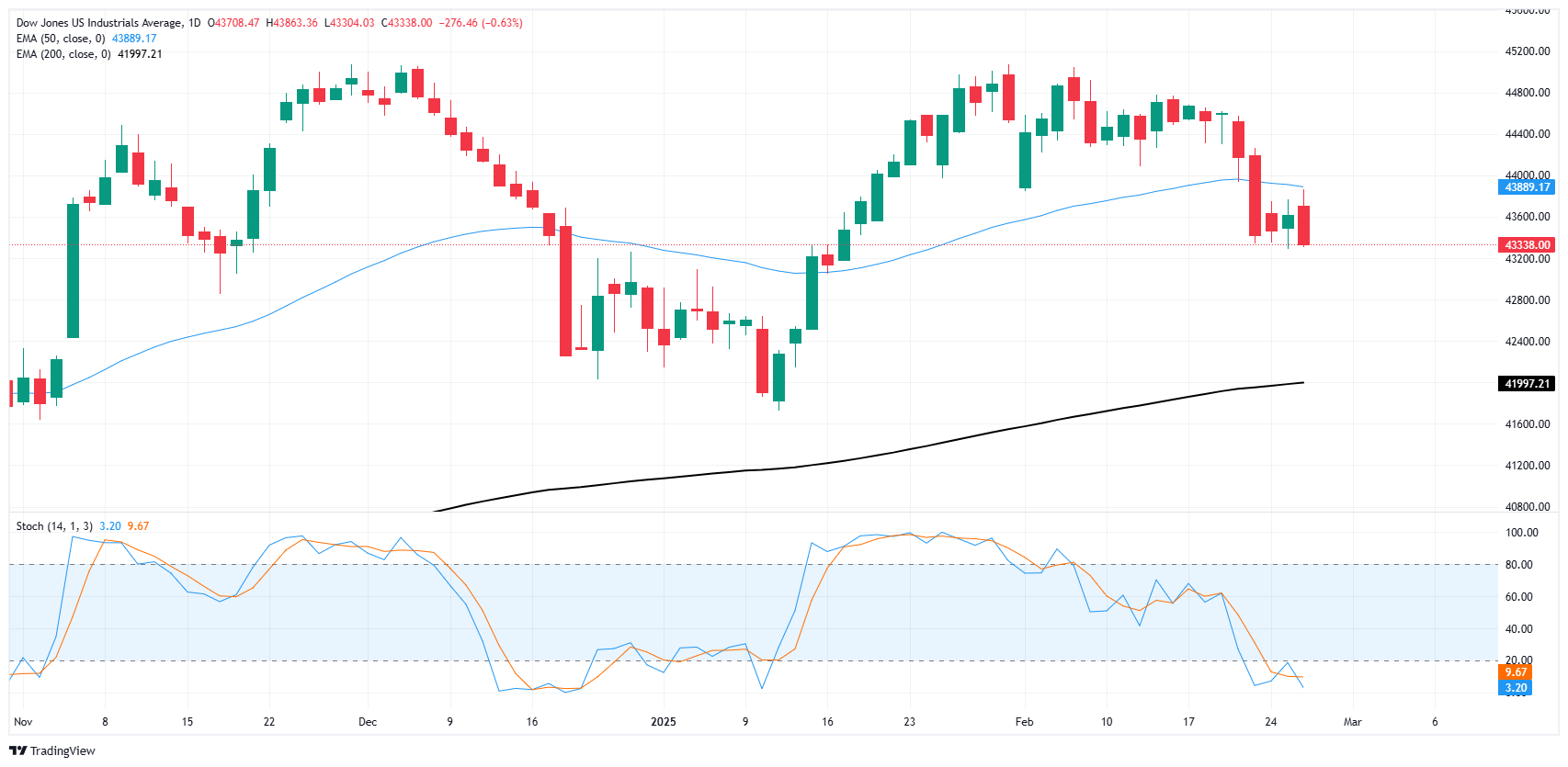 道琼斯工业平均指数(DJIA)未能跟随其他美国股指的小幅上涨,回落约200点,因为投资者在面对美国总统唐纳德·特朗普重新提出的关税威胁时感到不安