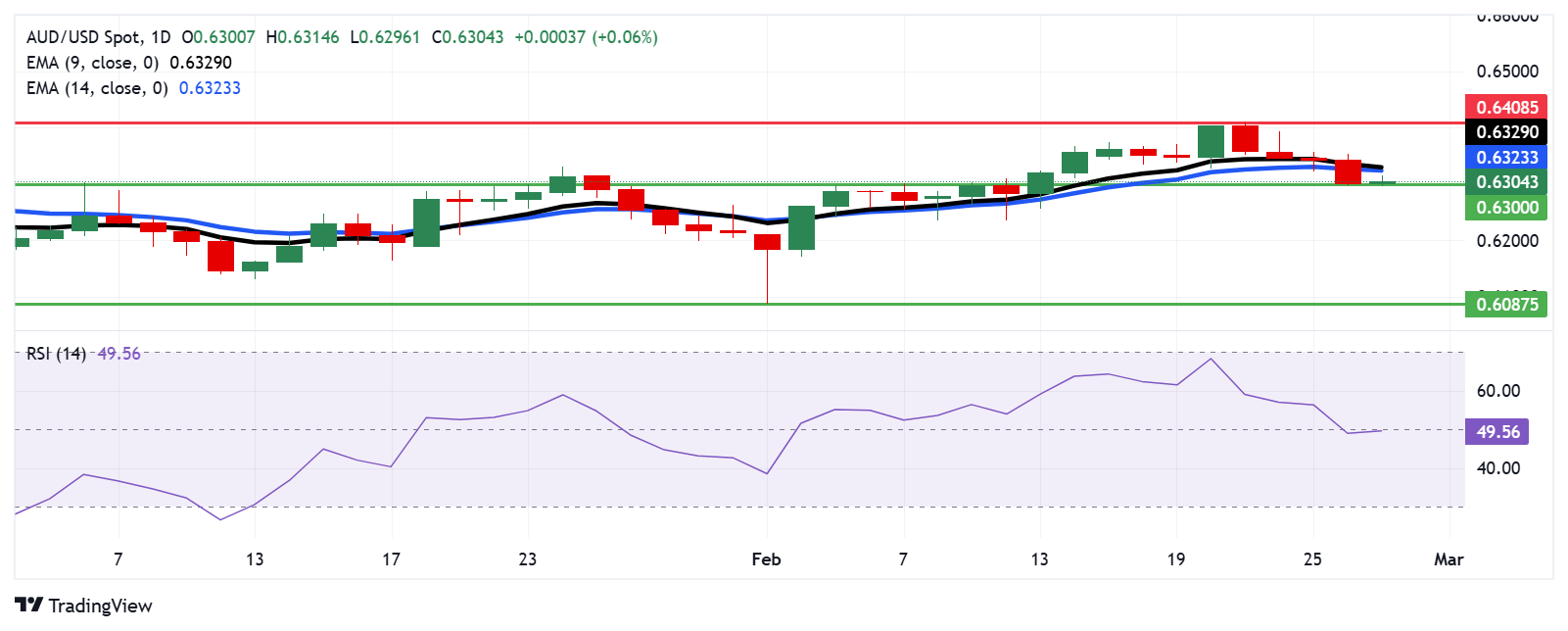 澳元/美元跌至0.6300附近,因美元(USD)延续其反弹。