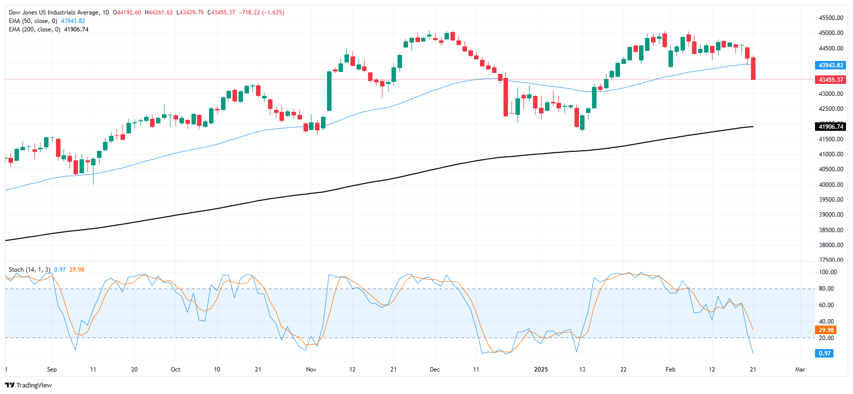 道琼斯工业平均指数(DJIA)周五下滑超过 700 点,跌幅约为 1.5%,触及 43,500 水平,为一个多月以来首次。
