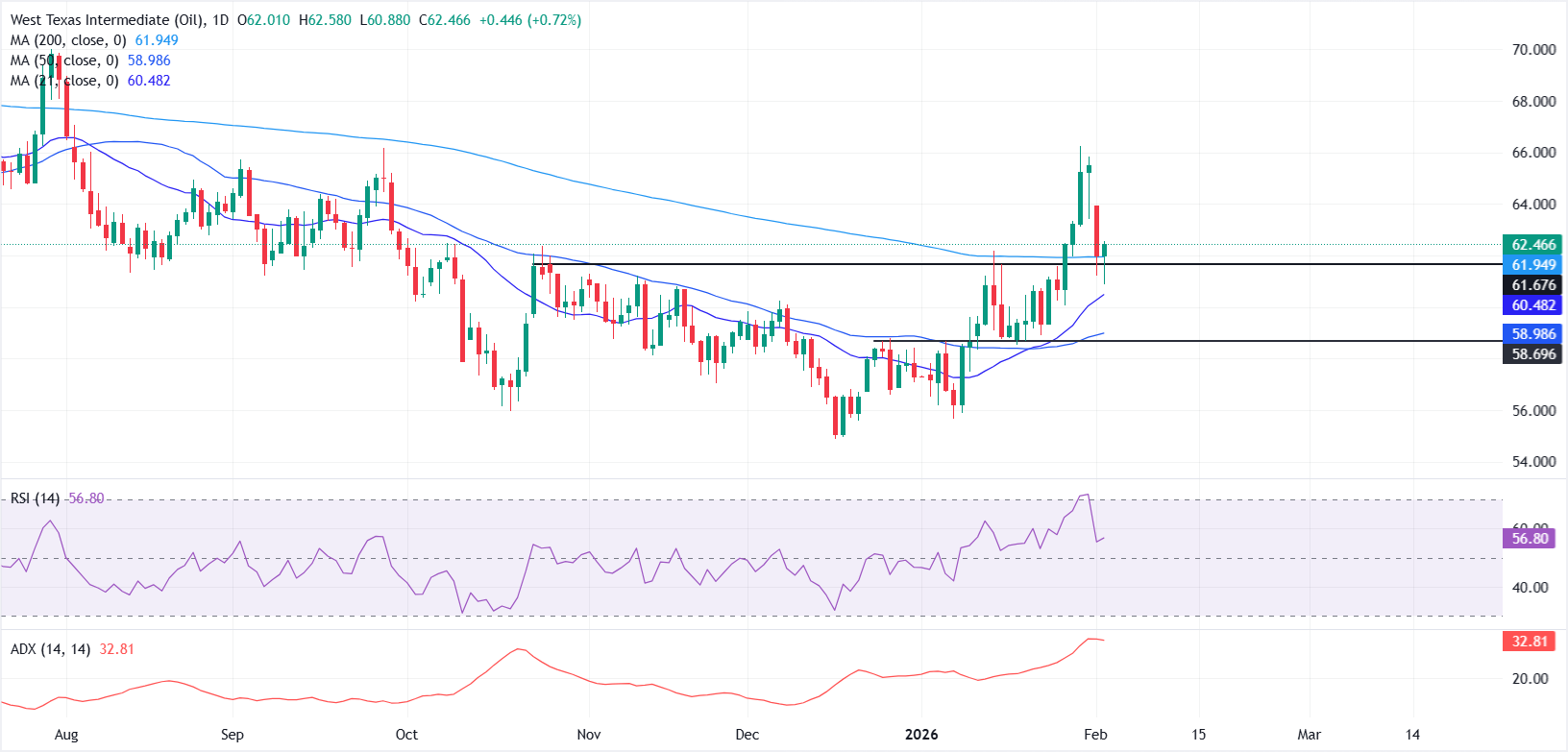 西德克萨斯中质原油(WTI)在周二出现技术性反弹,买家在60美元心理关口前入场。截至发稿时,WTI每桶交易约62.45美元,当日上涨约0.70%,扭转了早前的盘中亏损。