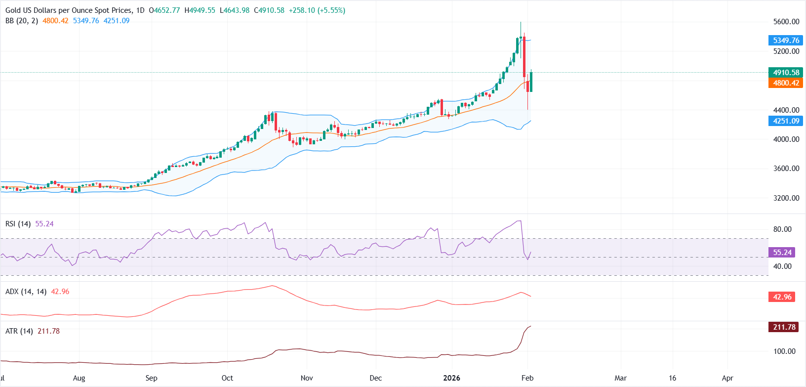 黄金(黄金/美元)周二上涨超过 5%,因为在上周从接近 5,600 美元的历史高点剧烈回调后,抄底买家重新进入市场。撰写本文时,黄金/美元在 4,980 美元附近徘徊,正在从周一接近四周低点 4,40