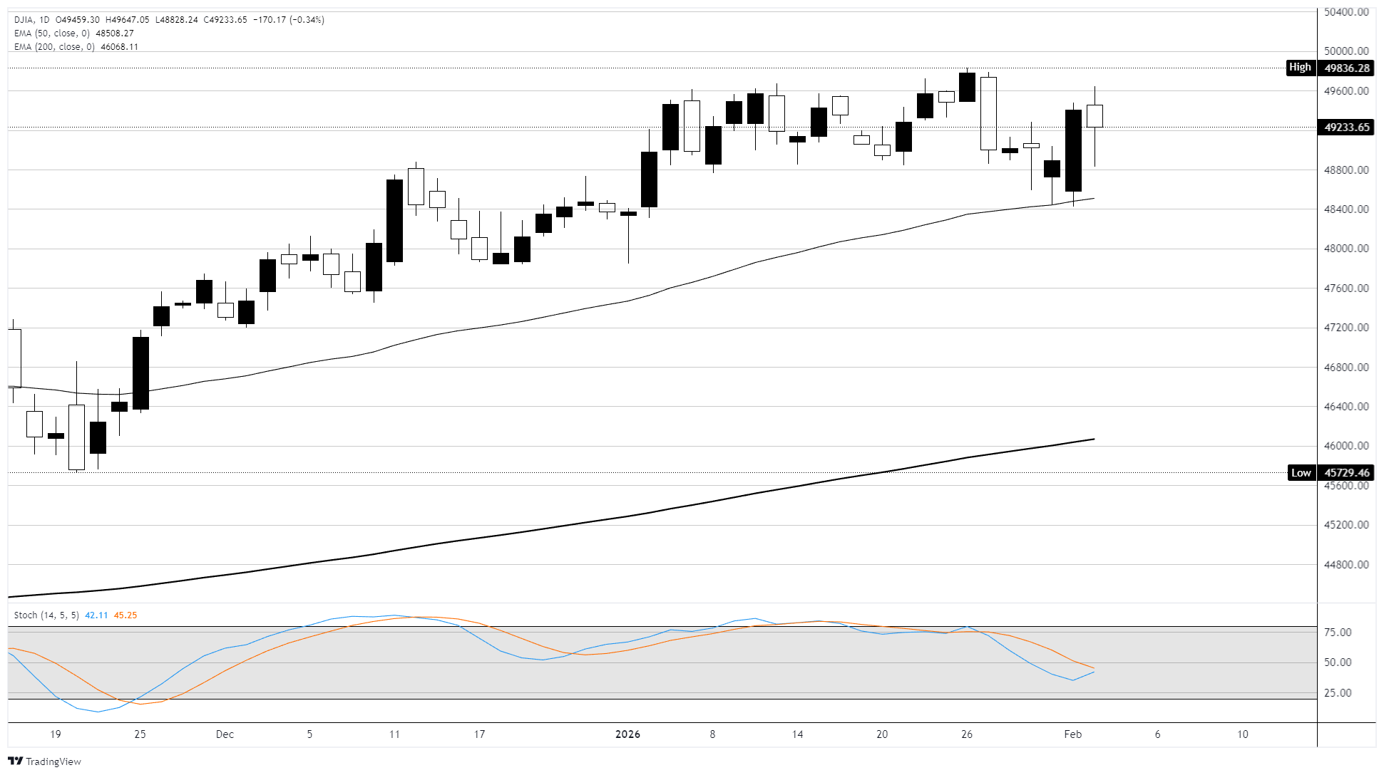 道琼斯工业平均指数(DJIA)周二在震荡区间交易,盘中一度触及 49,653.13 的新高后,回落约 166 点,或 0.3%。标普 500 指数下跌 0.8%,投资者抛售科技股,而纳斯达克综合指数下