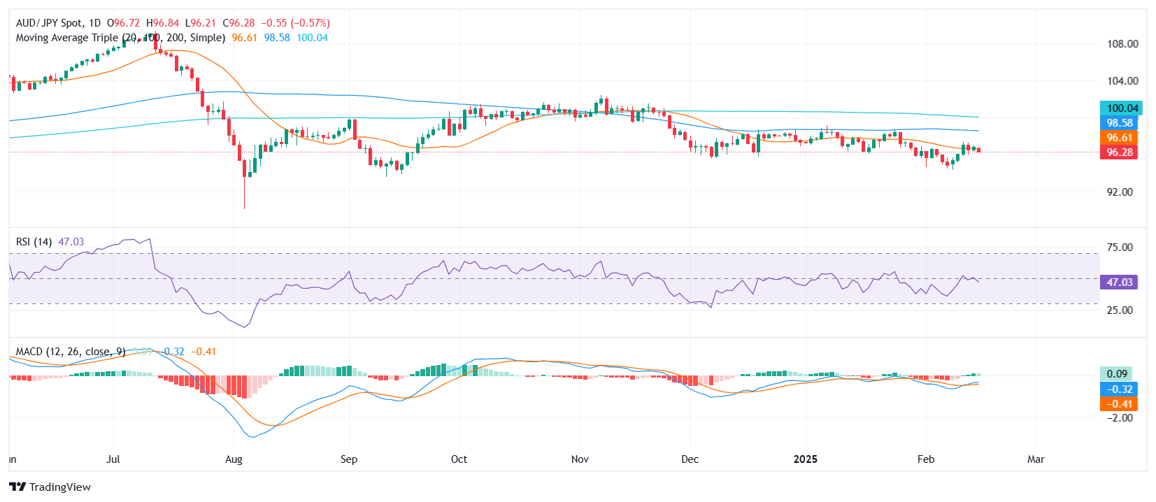 澳元/日元周一继续下跌,下降0.42%至约96.30。