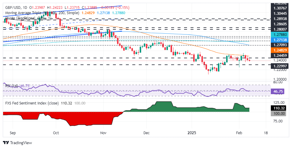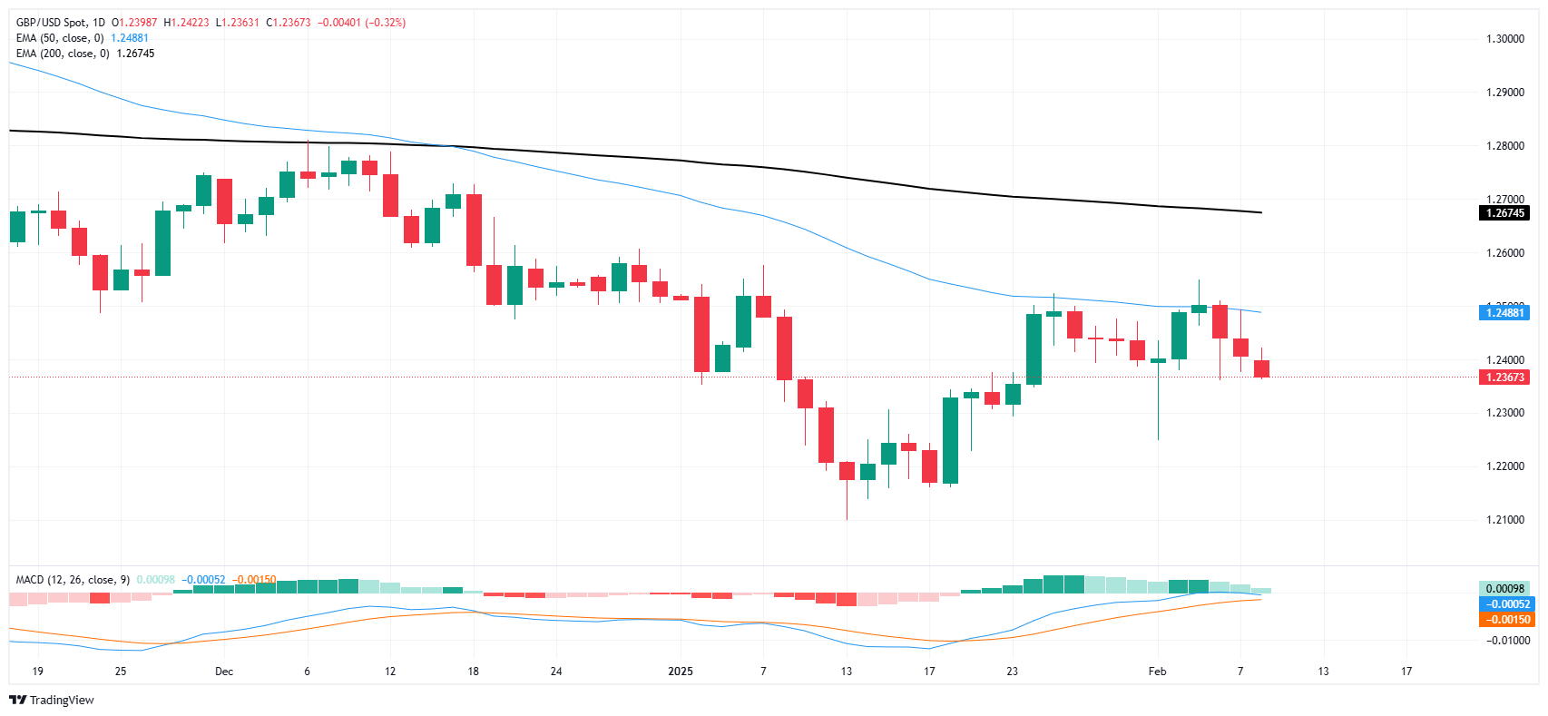 英镑/美元在周一连续第三个交易日下跌,开启新交易周时处于弱势,跌回 1.2400 美元关口下方,过程中下滑了 0.33%