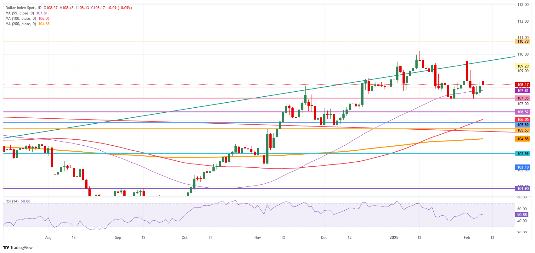 美国美元指数(DXY)跟踪美元对六种主要货币的表现,未对周末发布的大量关于关税的头条新闻作出任何反应。美国总统唐纳德