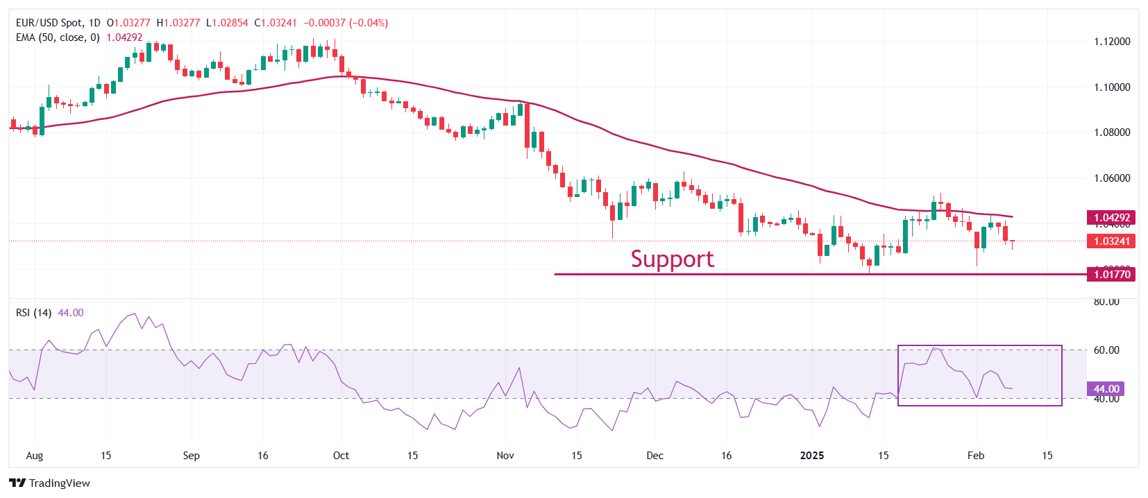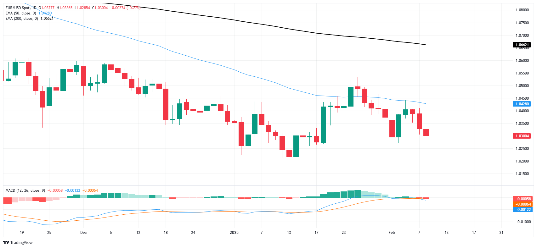 欧元/美元周一下跌约三分之一个百分点,回落至1.0300关口,市场情绪疲软。