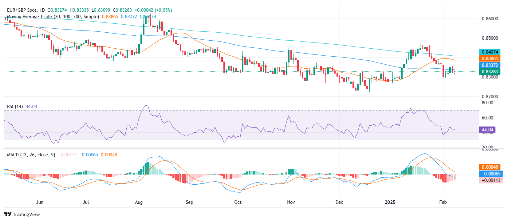 欧元/英镑货币对周一小幅上涨至 0.8330,但仍面临压力,难以重新夺回 100 日简单移动平均线(SMA)。