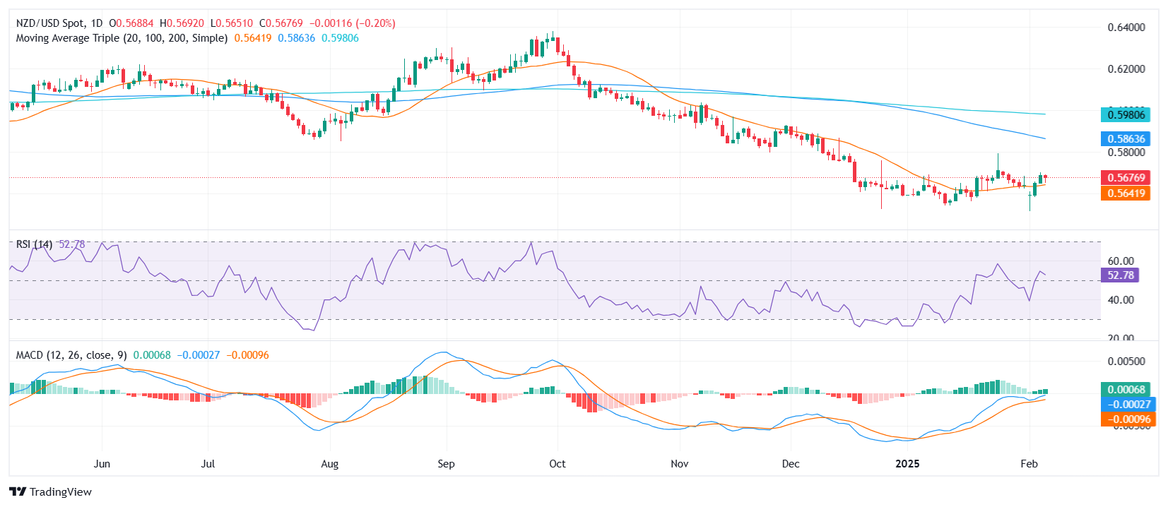 纽元/美元周四走软,下跌0.21%至0.5675,但仍保持在20日简单移动均线(SMA)上方