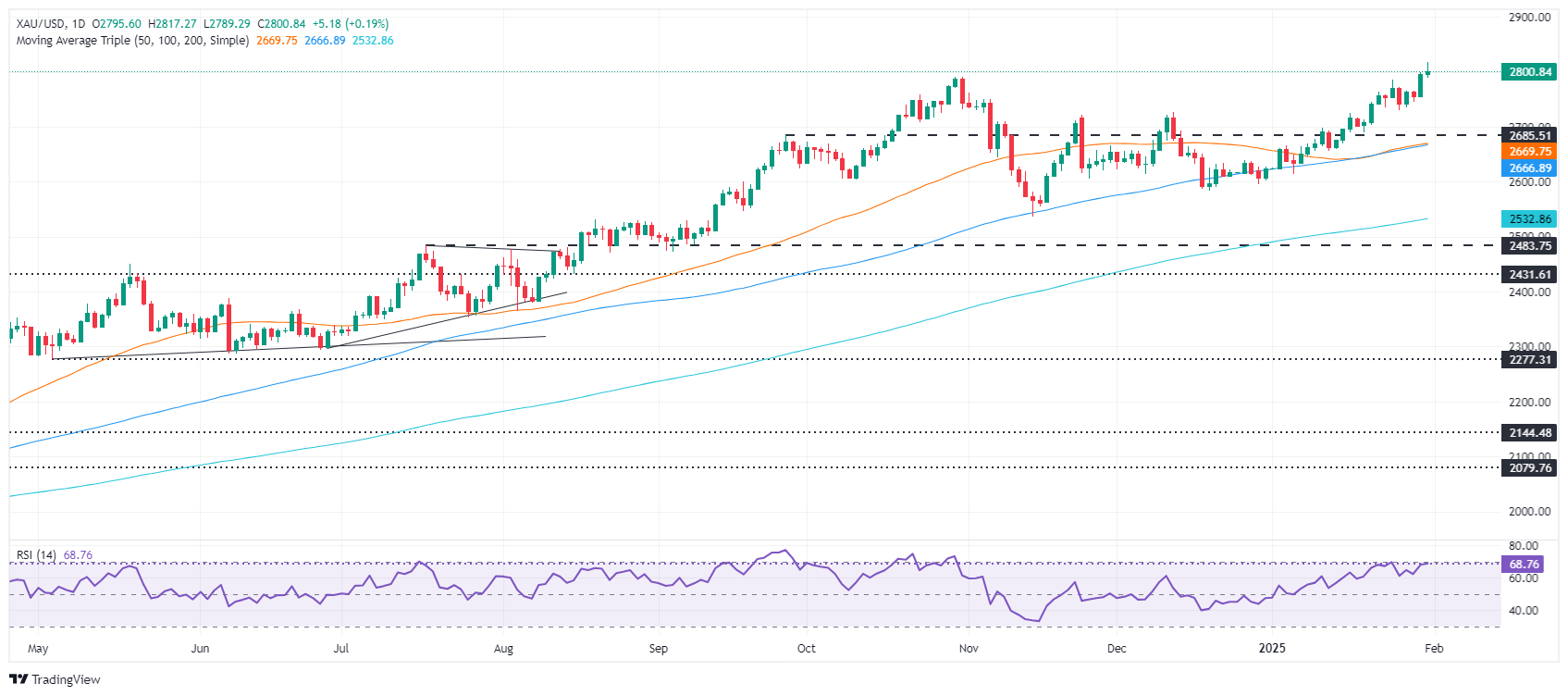 周五,黄金价格在2800美元上方接近历史高点,因为市场参与者在白宫纠正了早些时候路透社关于美国将于2月1日对加拿大和墨西哥不征收关税的报道后变得风险厌恶,取而代之的是将于3月1日征收关税