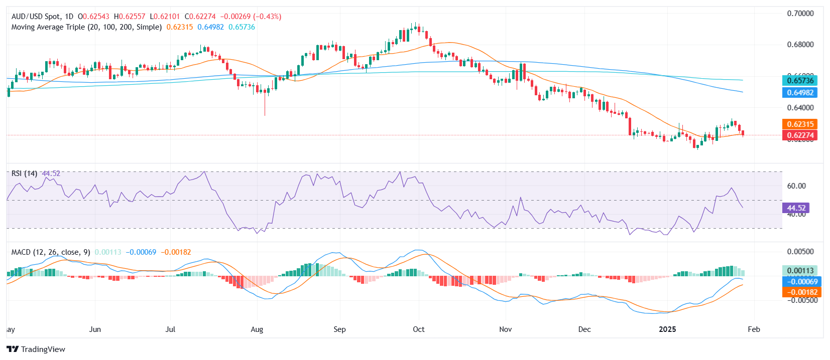 澳元/美元周三下跌0.57%至0.6225,徘徊在0.6250以下的周低点附近