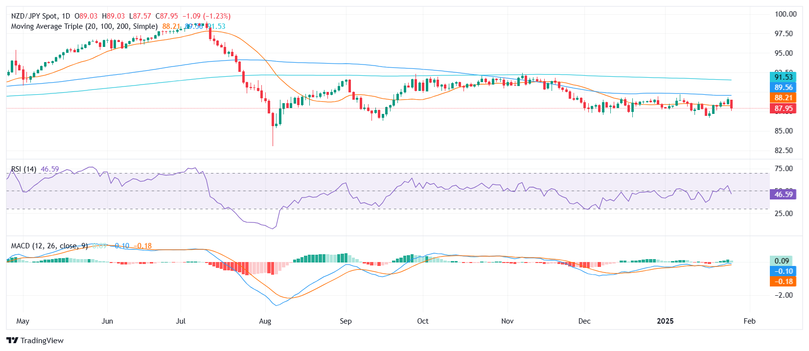 纽元/日元周一大幅下跌1%,降至87.95,跌破其20日简单移动均线(SMA)