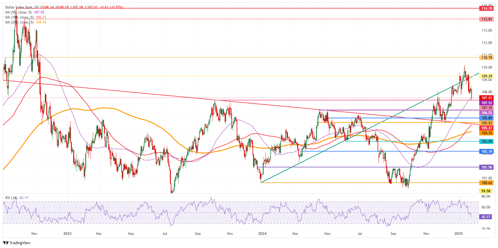 美元指数(DXY)追踪美元兑六种主要货币的表现,在一个多事的周五回落至107.50下方,周五日内下跌,此前美国总统唐纳德·特朗普前一天发表了令人惊讶的评论
