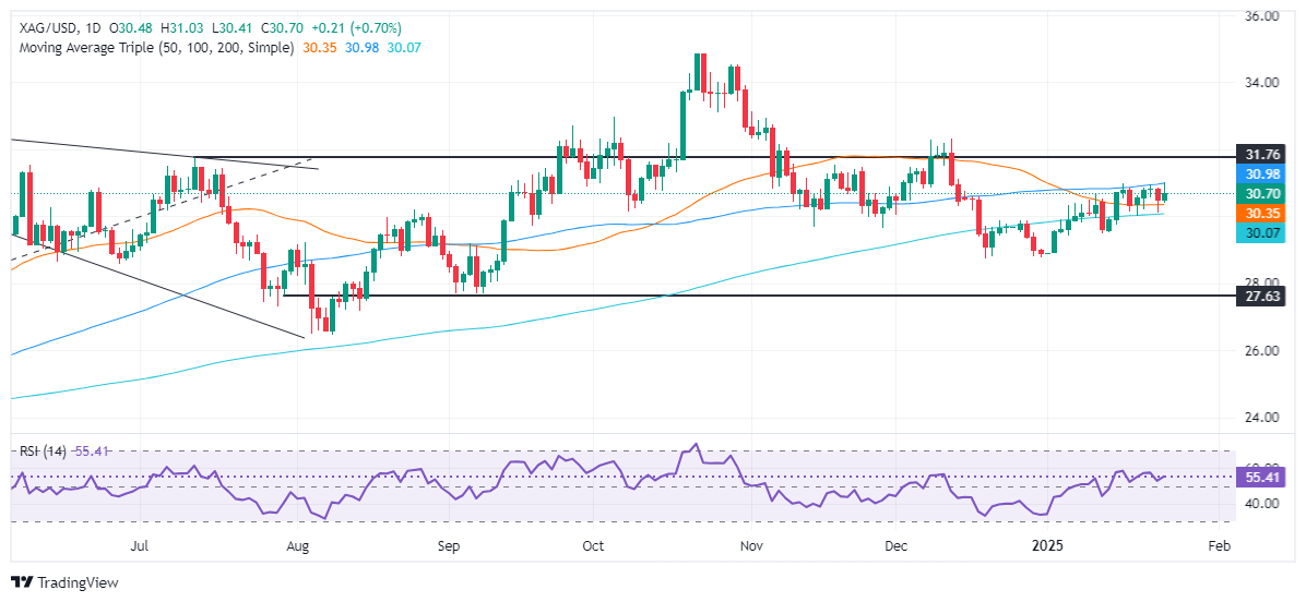 白银价格回升并上涨0.91%,但未能突破100日简单移动平均线(SMA)30.95美元的关键阻力位