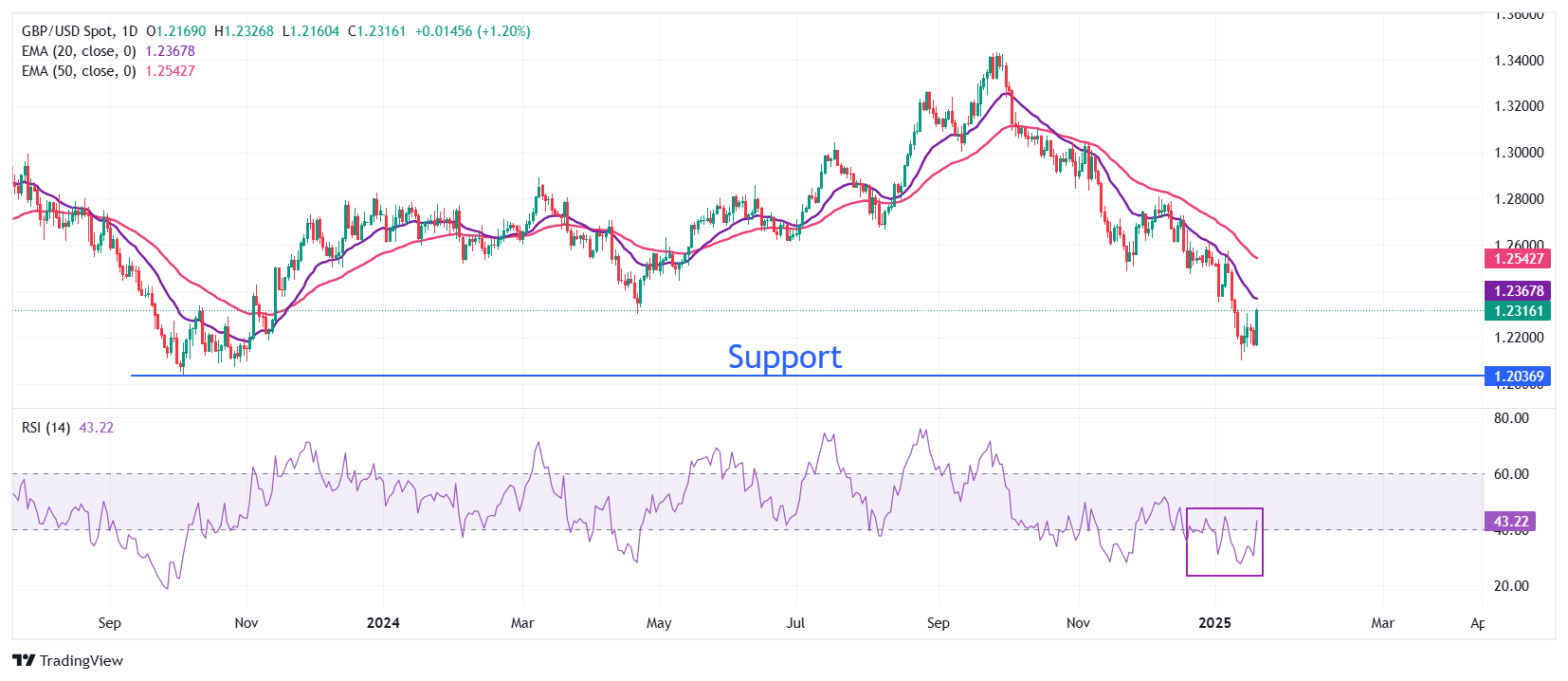 英镑 (GBP) 在周一北美时段飙升至接近 1.2320 美元 (USD)