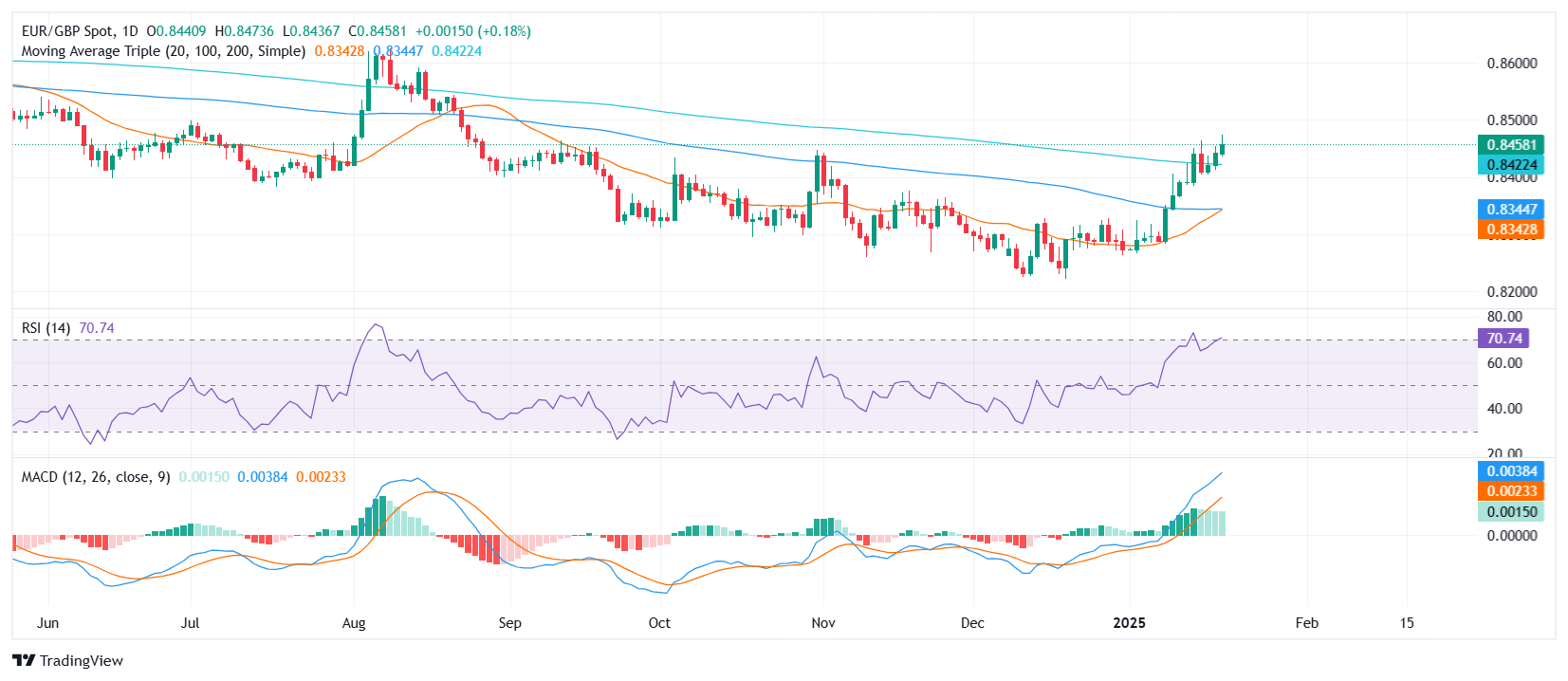 欧元/英镑交叉盘周一进一步上涨,达到0.8460并短暂触及0.8475
