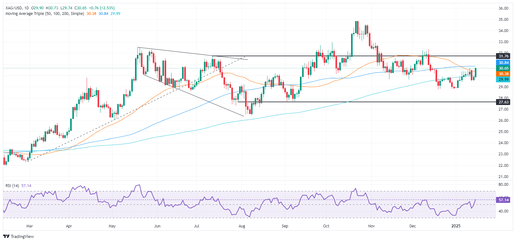 白银价格反弹,升至 30.32 美元的 50 日简单移动均线 (SMA) 上方,并瞄准突破 100 日简单移动均线