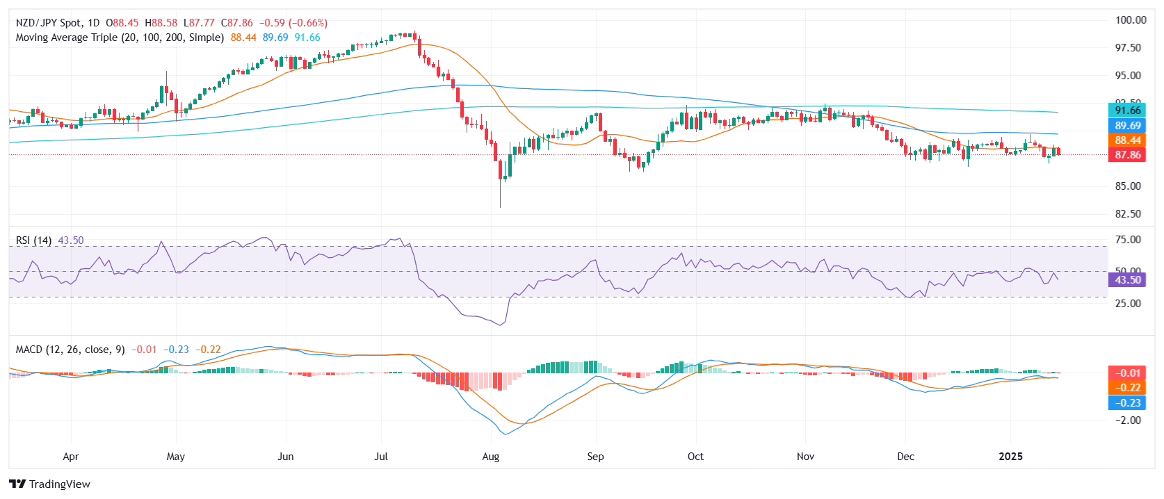纽元/日元交叉盘周三进入更深的负值区域,下跌0.77%,收于87.80附近