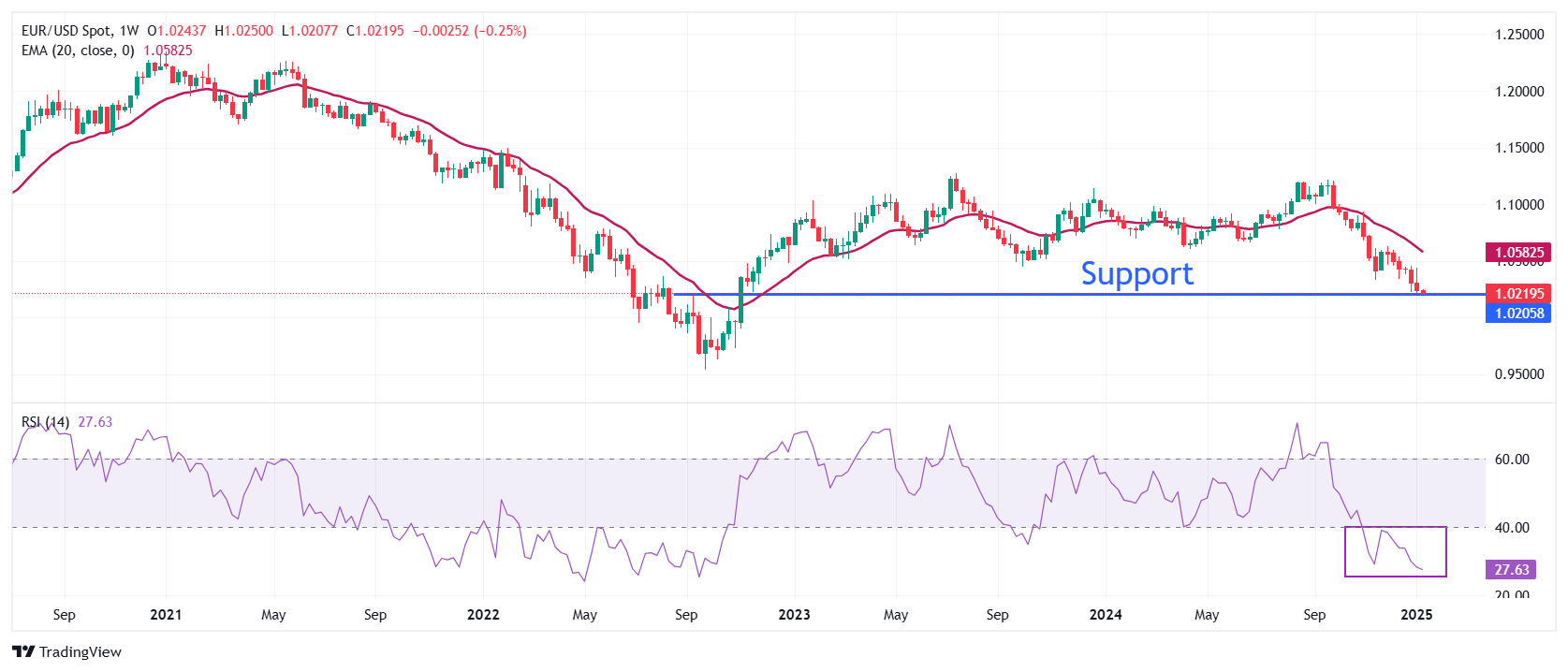 欧元/美元在本周初滑落至接近1.0170的两年多新低。
