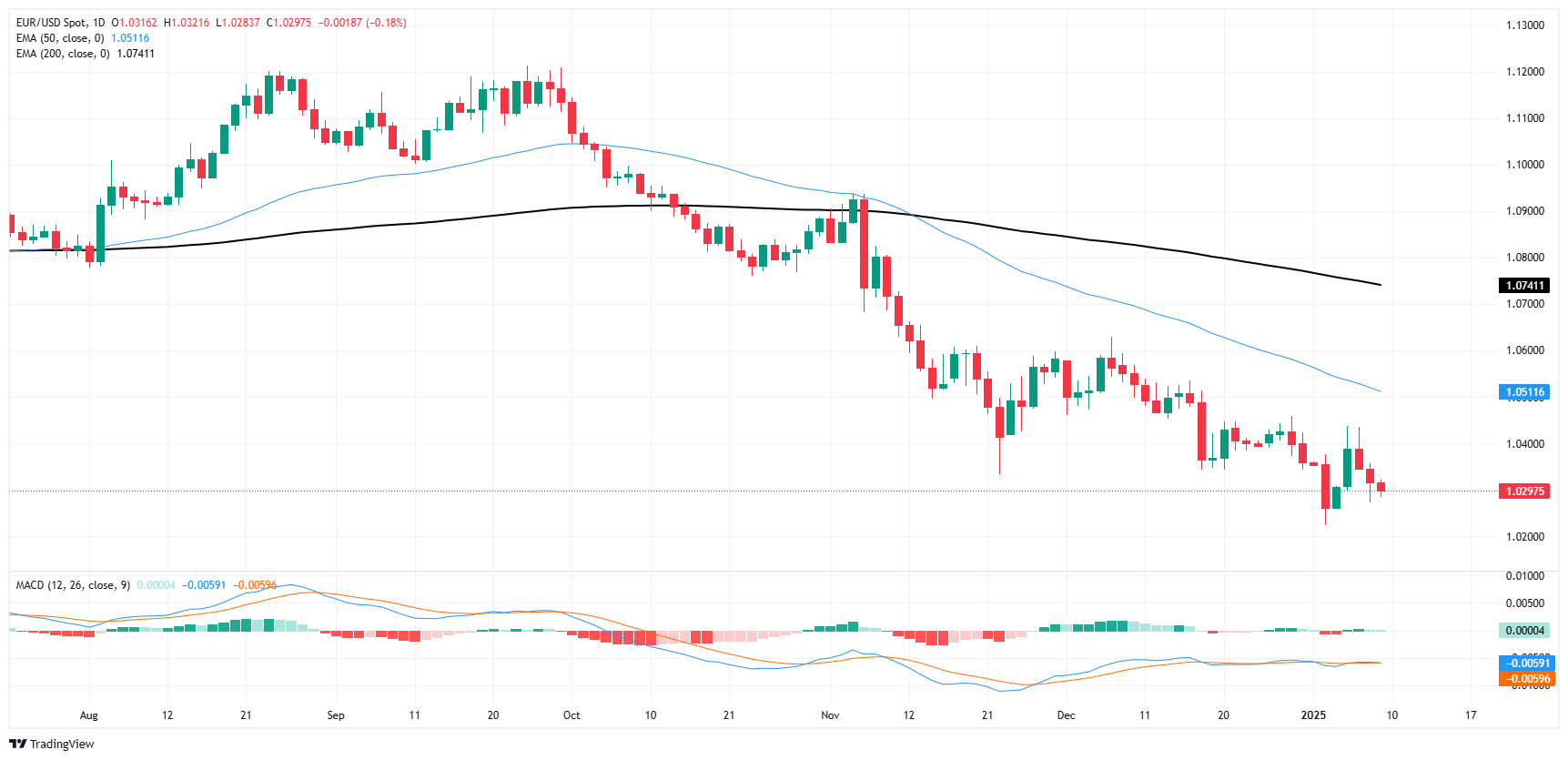 欧元/美元对周四继续其下行趋势,下跌0.18%至约1.0305。