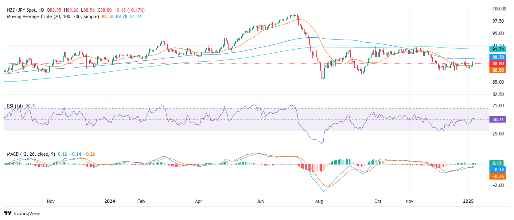 周三,纽元/日元回落,下跌 0.33% 至 88.75 附近。