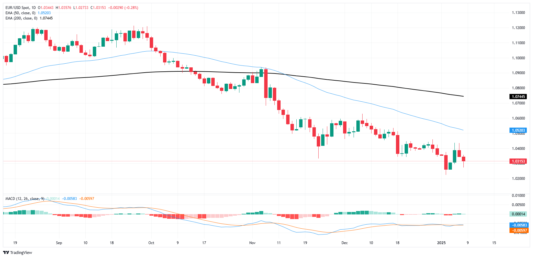 欧元/美元周三表现挣扎,下跌 0.48% 至约 1.0295。