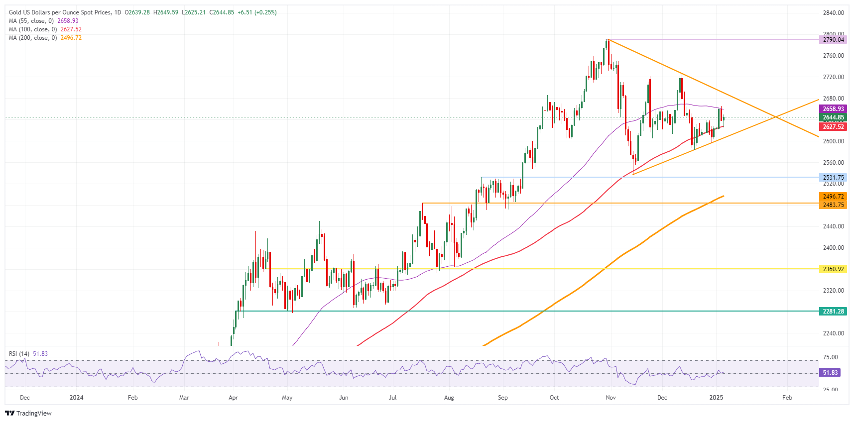 黄金价格(黄金/美元)在2025年的第一个交易日快速冲刺走高后,周一在2640美元附近企稳,因为交易员们相当急切并迅速地重新建立了他们在圣诞节前削减的仓位。此后,尽管美国收益率仍然相当高,但黄金价格已