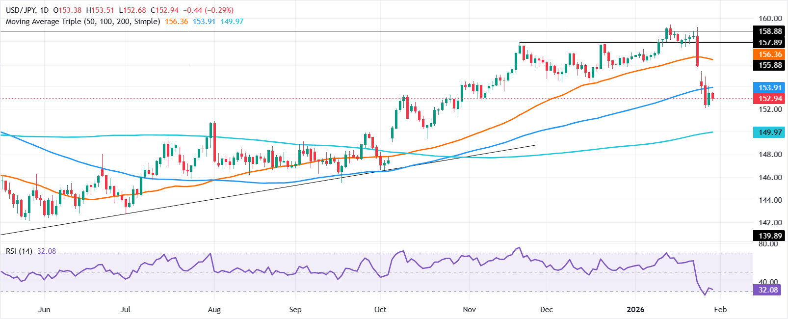 美元/日元在周四北美交易时段下跌,跌幅为0.33%,此前金融市场经历了美国股票、贵金属的抛售以及美元(USD)的轻微升值。撰写时,该货币对在152.70-153.00附近波动交易。