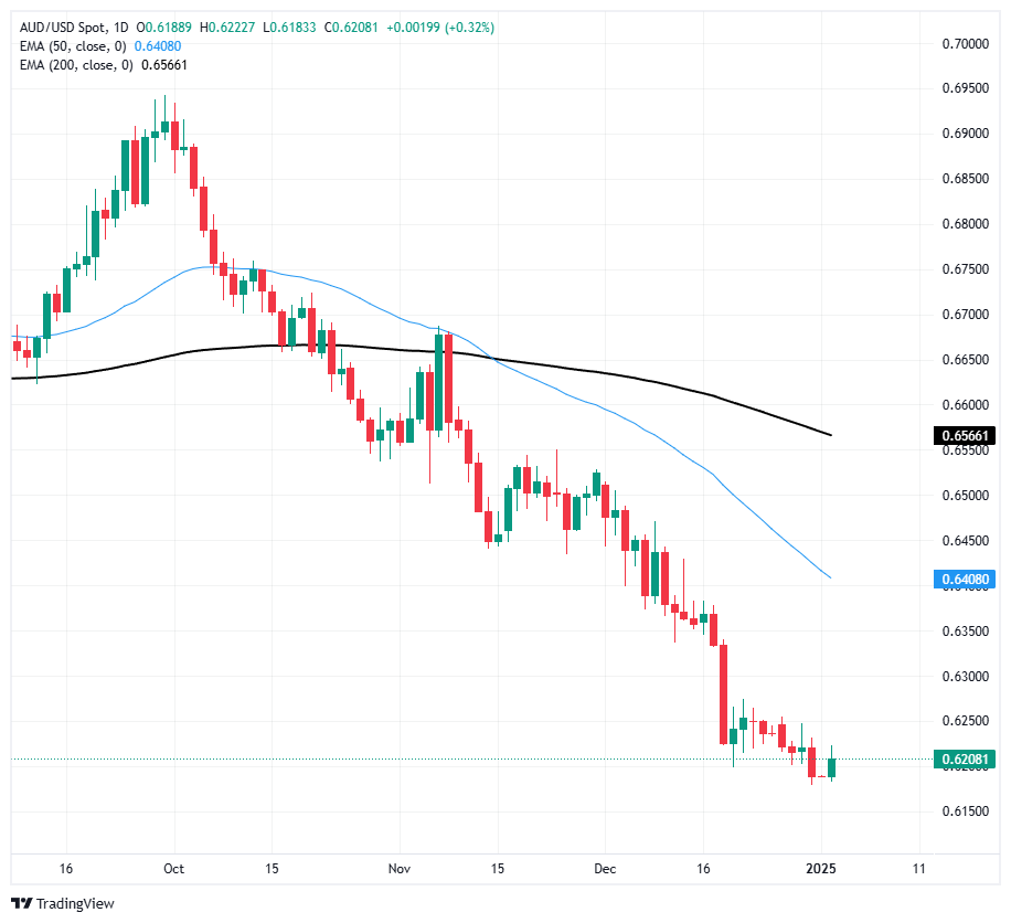 澳元/美元在2025年首个交易时段试图引发涨势,但未能成功,在成交量清淡的情况下上涨,随后在当天晚些时候回落至0.6200关口。市场大举涌入避险货币对澳元,使澳元处于守势,澳元在两年低点的弱侧陷入徘徊