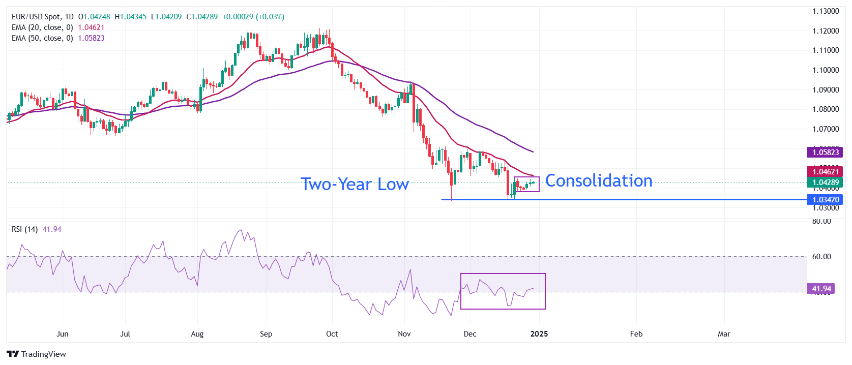 由于周一欧洲时段交投流动性不佳,欧元/美元在略高于1.0400区域交投乏力。欧元(EUR)兑美元(USD)将以近5.5%的跌幅结束本年度,在2024年的最后三个月里,由于欧洲央行(ECB)维持鸽派的利