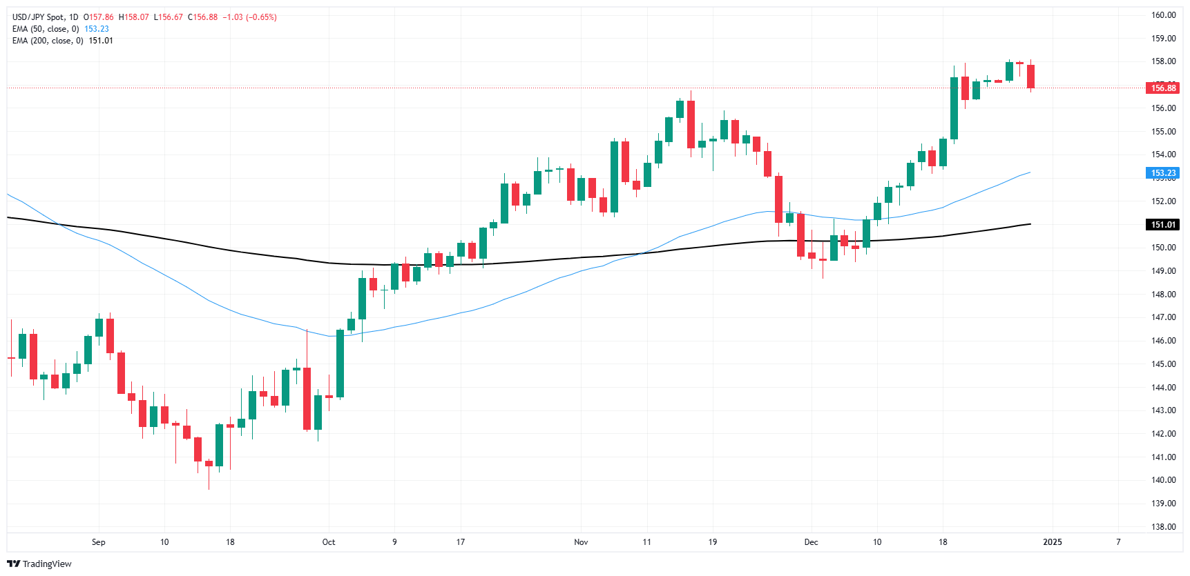 美元/日元周一出现回落,下跌0.7%,并被打回157.00关口下方,周三元旦假期休市前美元/日元逼近中线。年末假期时段如火如荼,大盘交易量依然低迷。