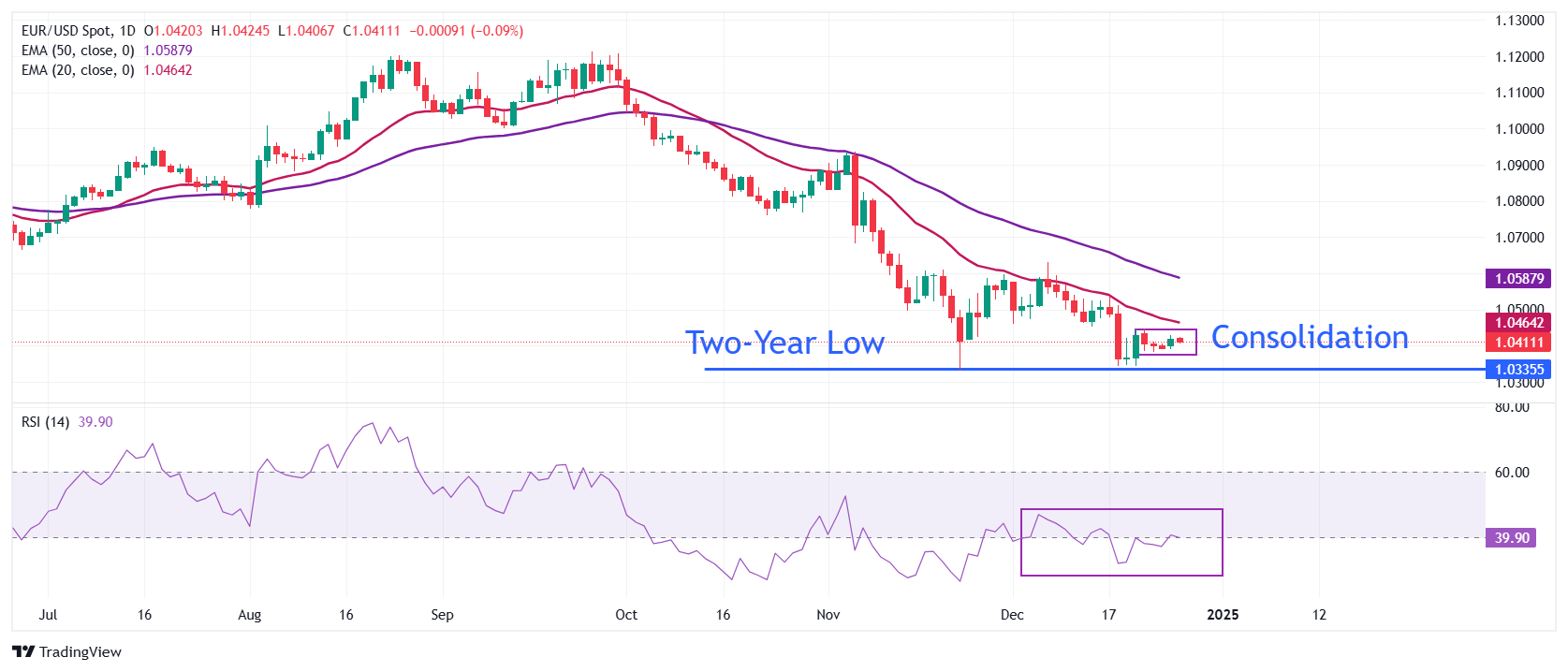 周五欧洲时段,欧元/美元在1.0400附近窄幅交易,市场参与者因圣诞假期保持观望,交易清淡。该货币对努力寻找方向,而美元(USD)则在美联储(Fed)将遵循逐步放宽政策的坚定预期下走高,因为通货膨胀在